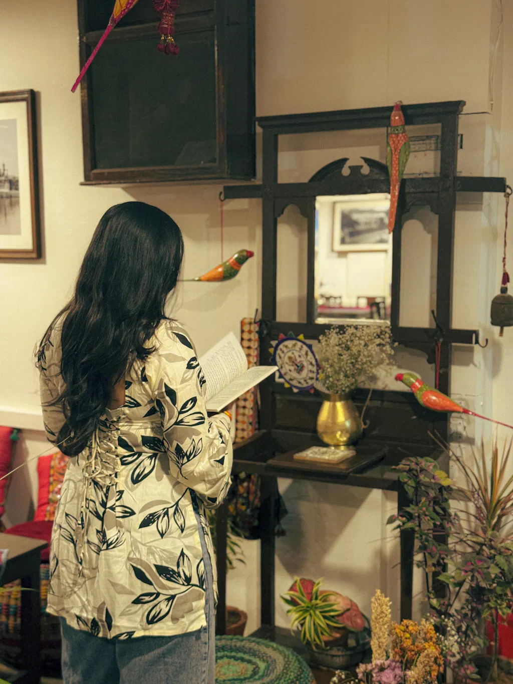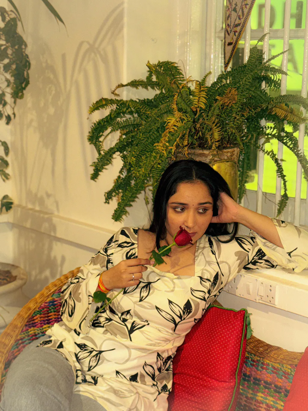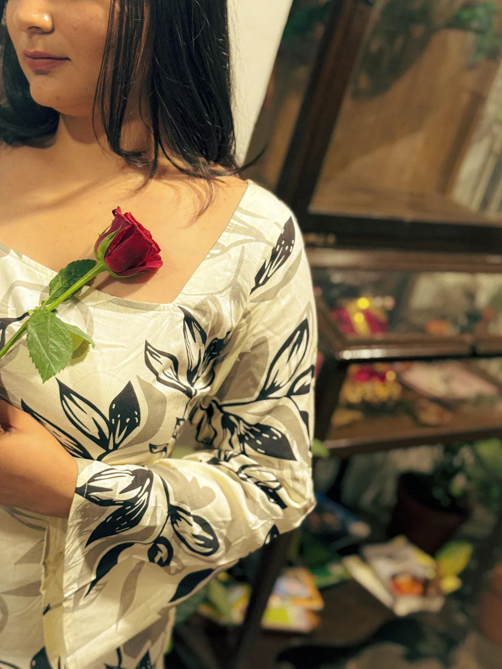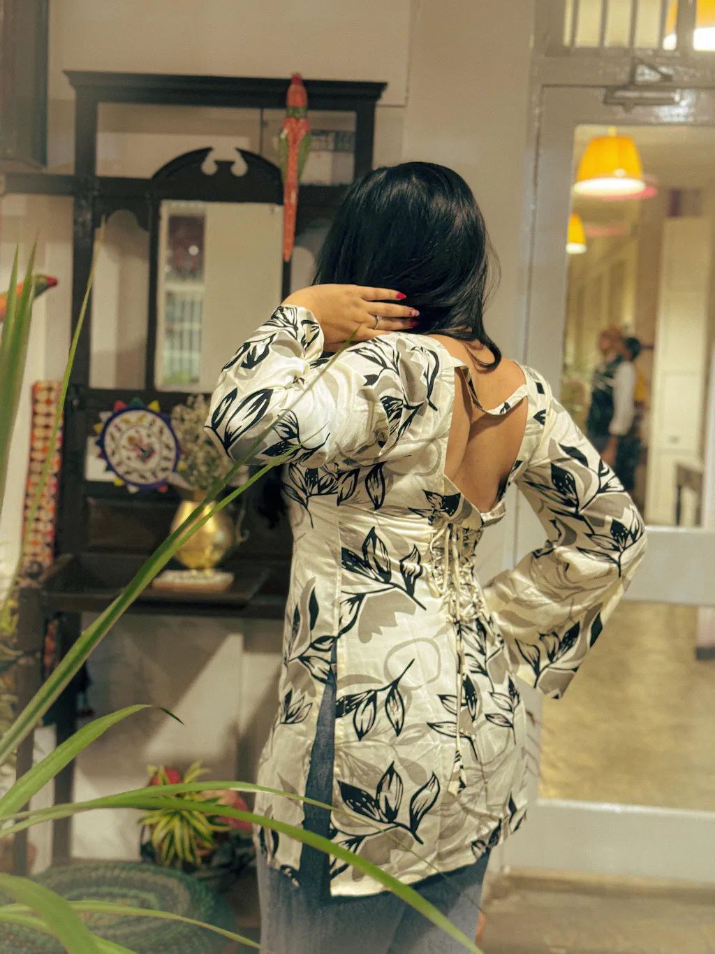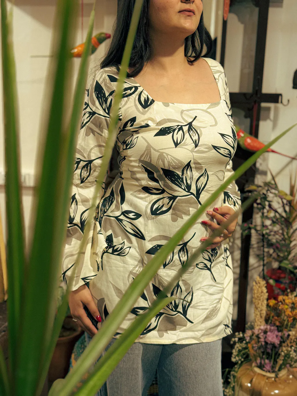 Step out in style with this effortlessly chic ivory kurti, featuring a bold, artistic leaf print in contrasting black and grey. This piece masterfully blends classic design with modern flair, showcasing elegant flared sleeves and a contemporary square neckline. The defining feature is its stunning corset-style lace-up back, which adds a unique touch of sophistication and allows for a beautifully tailored fit. Perfect for any occasion, this kurti pairs wonderfully with dark-wash jeans for a striking monochrome look.
