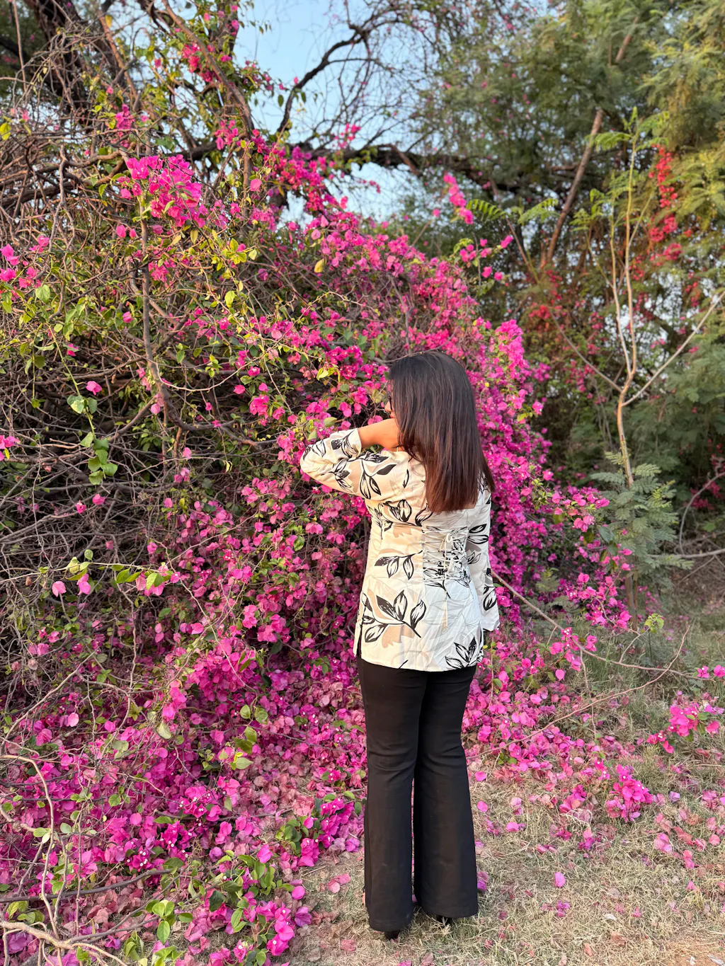 Color & Print: Ivory Base with a Bold Black & Grey Leaf Print