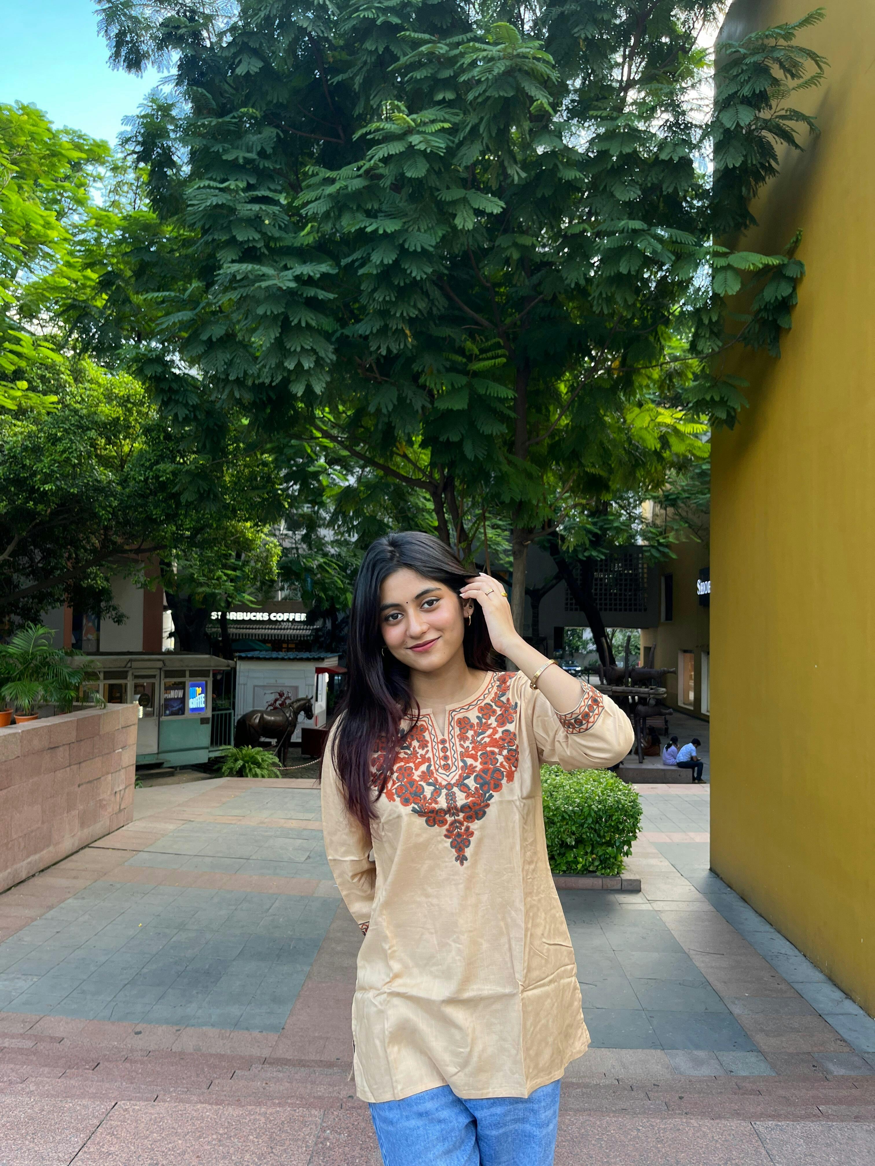 Wheat Beige Kashmiri Aari Embroidered Short Kurti